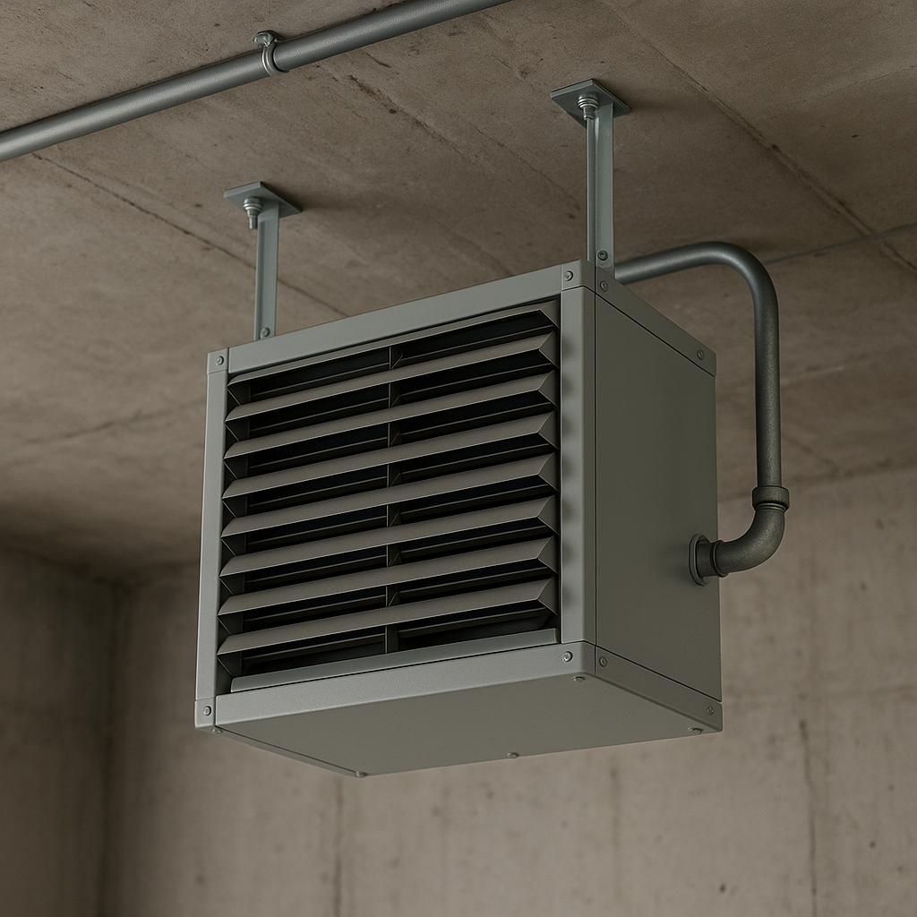 When air come in from the outside, in many climates, it needs to be heated or cooled to maintain comfortable temperatures inside. So, the intake may actually be a heating unit, cooling unit, both. Sometimes inside, near the intake, we can place a separate heating unit, such as a unit heater, which can be electric or gas powered.